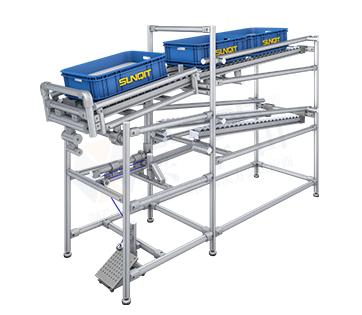 3.操作員松開踏板,旋轉臺因杠桿原理,自動上升,同時分離止動件受力旋轉,裝有物料的周轉箱失去阻擋,自動滑出。